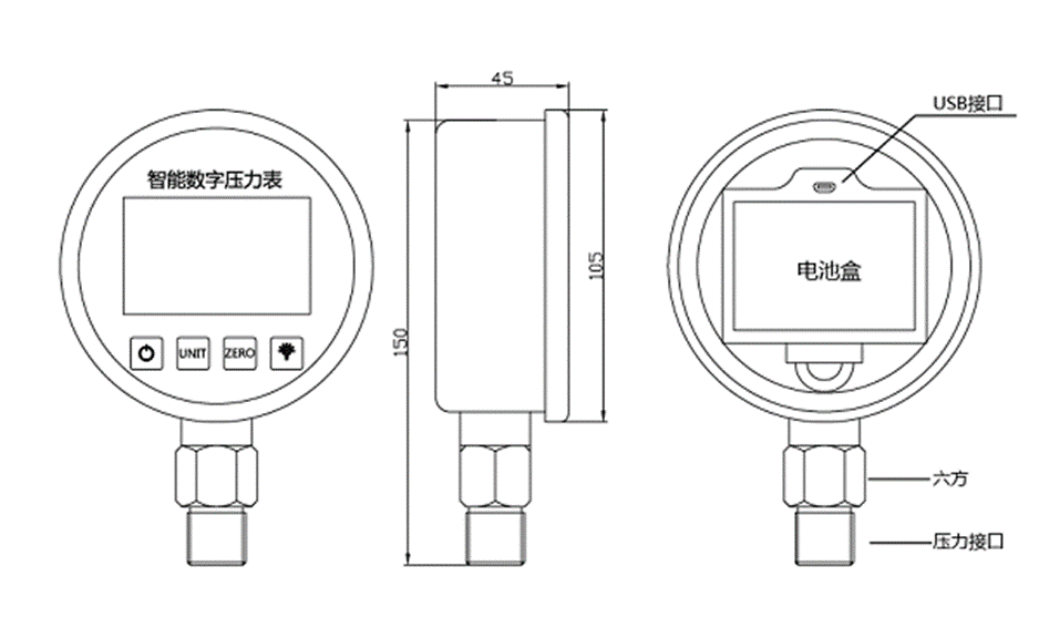 SUAY80压力控制开关是一款高精度智能型数字压力表,内置高精度压力传感器,能够准确的实时显示压力,并且具有精度高、长期稳定性好的特点。配备5位显示的大尺寸LCD液晶显示,具有清零、背光、开关机、单位切换、低电压报警、峰值记录等多种功能,操作简单,安装方便。壳体和接头采用304不锈钢,抗震性好,能够测量气体、液体、油等对不锈钢无腐蚀的介质。用3节5号电池供电,也可以采用USB供电,续航功耗低、时间长,适用于便携式压力测量、设备配套、校验设备等压力测量领域。